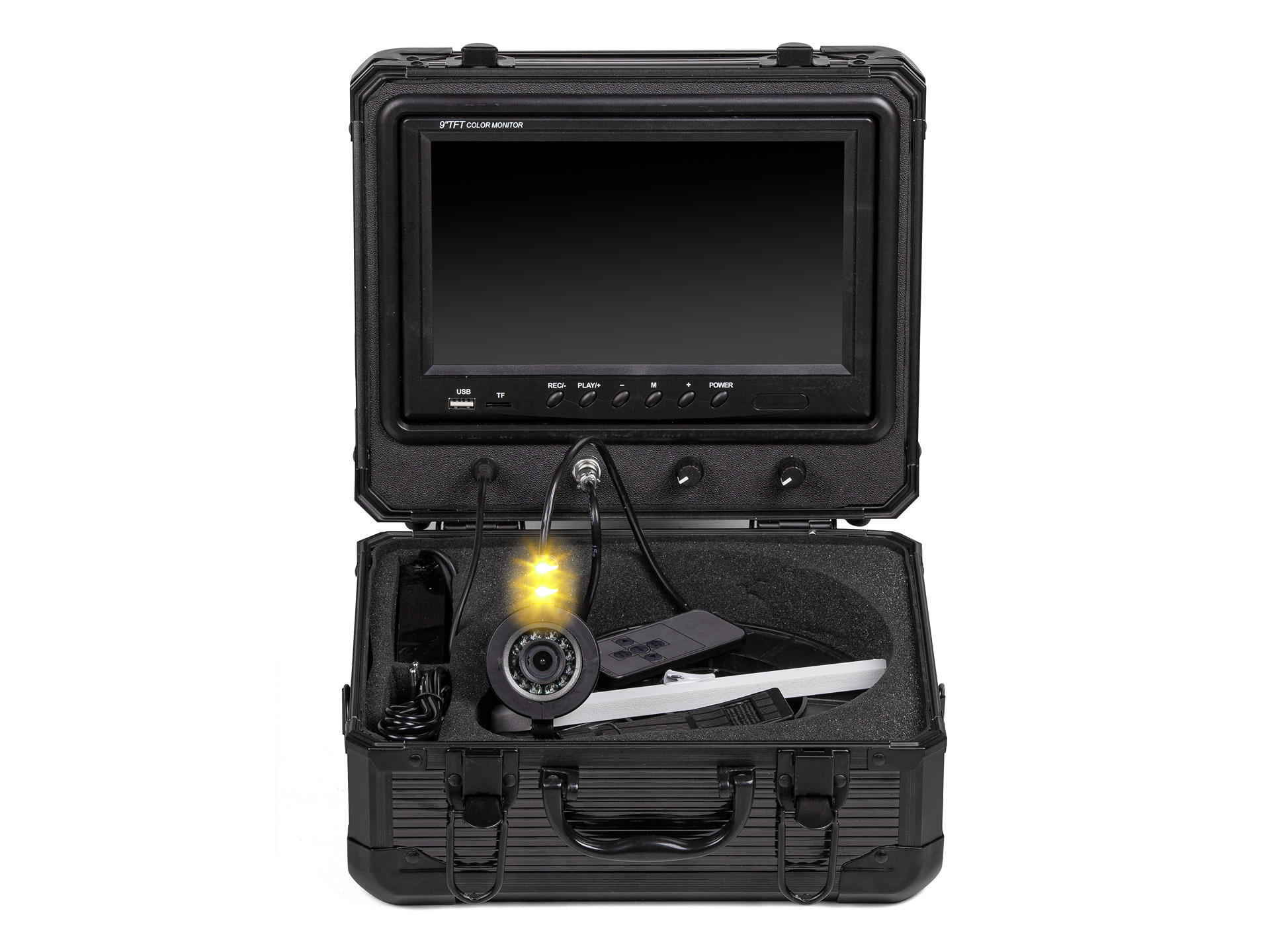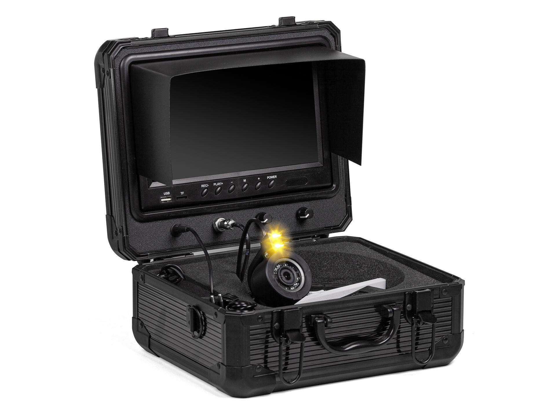 Разработчику удалось добиться максимального удобства при использовании подводной камеры для рыбалки ЯЗЬ-52 на водоеме даже в суровых зимних условиях. Все части комплекта размещены компактно и удобно в крепком алюминиевом кейсе. Это гарантирует защиту монитора и камеры от механических повреждений, а также удобство эксплуатации, транспортировки и хранения. Для начала работы с камерой ЯЗЬ-52 необходимо открыть кейс, вставить 2 разъёма (питание и видео). И всё! Подводная камера для рыбалки ЯЗЬ-52 готова к работе.